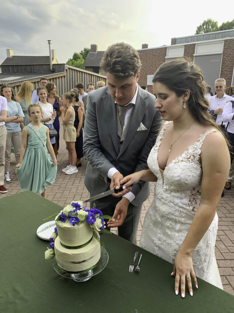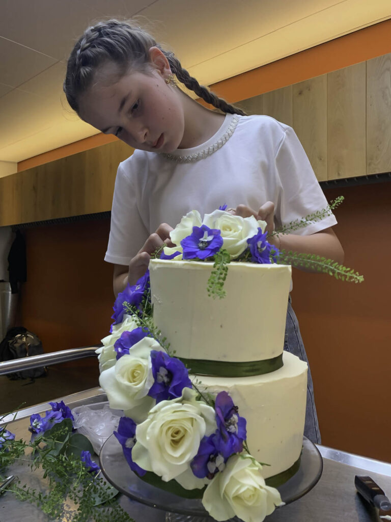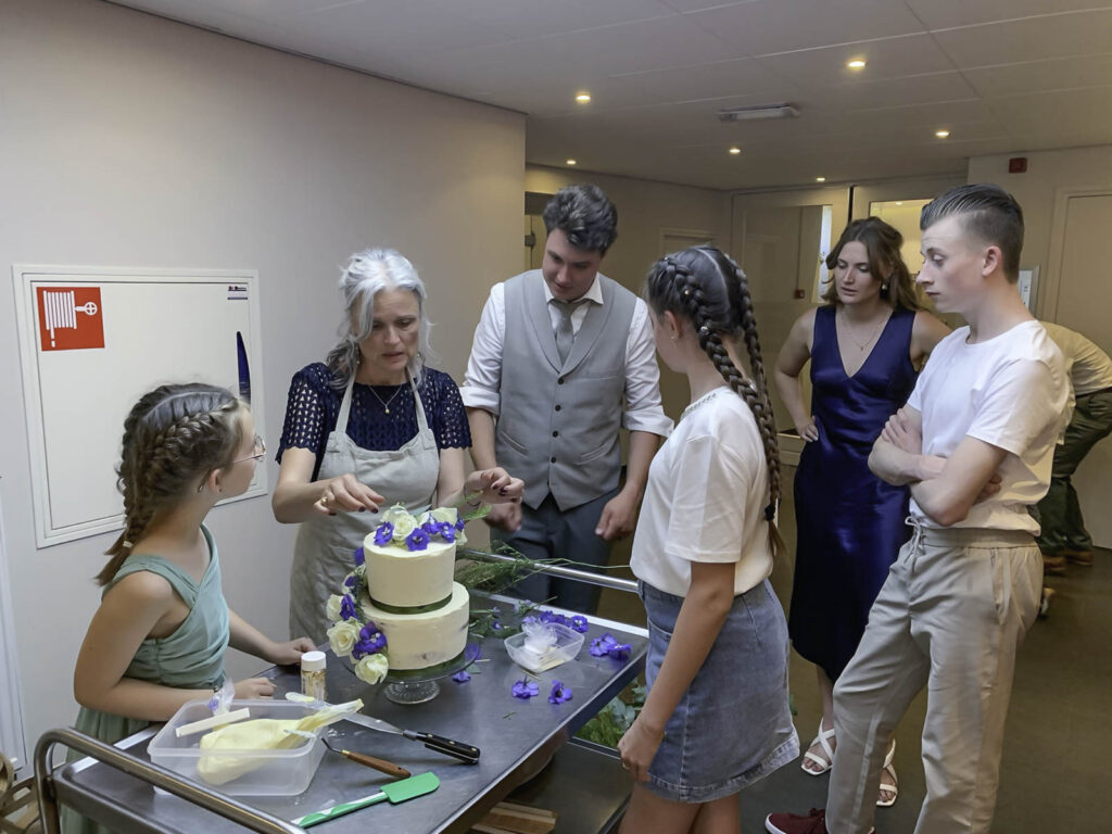 Mijn idee was om de taart in alle rust en helemaal zen in mijn eentje op te bouwen, maar al snel kwam mijn neefje naar me toe: “Mag ik je helpen?” Natuurlijk mocht dat! Al snel hadden de andere kinderen ook door dat er iets bijzonders gebeurde, en zo stonden we met z’n allen bloemen in de taart te steken. Het werd een ontzettend leuk en bijzonder moment om samen, voor het bruidspaar, de taart op te bouwen.